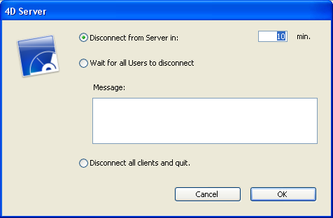 Além de informações dos usuários remotos 4D durante os acessos simultâneos os mesmos registros ou objetos, 4D Server inclui uma mensagem de aviso de encerramento interno através da rede.