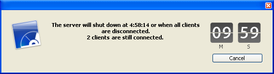 Nota: alternativamente, pode fechar o servidor utilizando a opção "Aguardar que todos os usuários sejam desconectados" (enviando-lhes uma mensagem pedindo-lhes para desconectar-se logo que possível) ou forçar a desconexão imediata dos clientes por meio da opção "Desconectar todos os clientes e sair".