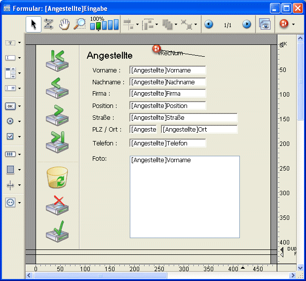 Da Projektformulare hauptsächlich über den Befehl DIALOG verwendet werden, stehen die Schaltflächen mit den Standardaktionen wie Nächster Datensatz, Datensatz löschen weder im Editor noch im Formularassistenten zur Verfügung. Sie müssen die Anzeige und Änderung von Datensätzen über Befehle der Programmiersprache steuern.