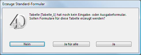 Versuchen Sie, die Datensätze einer Tabelle vor dem Erzeugen eines Formulars für diese Tabelle anzuzeigen, erscheint die Meldung, ob 4D ein Standardeingabe- und Standardausgabeformular anlegen soll: