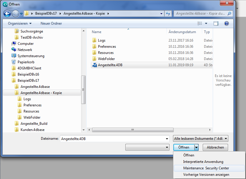 Auf dem Bildschirm erscheint der Standard-Öffnen Dialog, in dem Sie die entsprechende Datenbank auswählen können. Dabei wird die Datenbank nicht von 4D geöffnet.