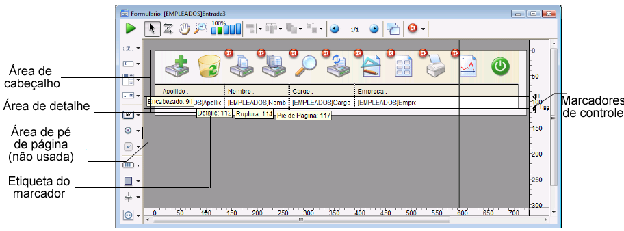 O tamanho das áreas de cabeçalho, detalhe, quebra e pé de página são ajustados movendo os marcadores de controle de saída.