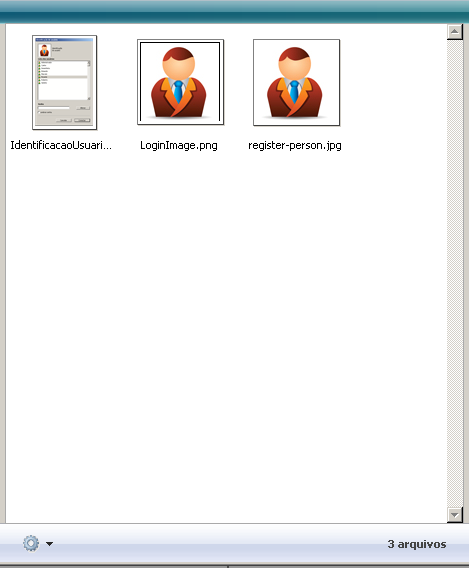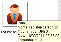 No modo Vista em miniaturas, os arquivos da pasta selecionada são mostradas em forma de miniaturas (thumbnails). Os arquivos de tipo imagem são pré-visualizados (se o formato de imagem é reconhecido por 4D) e os outros tipos de arquivos aparecem com seu ícone sistema. Neste modo de visualização, um menu contextual oferece acesso aos comandos de edição de arquivos. Uma mensagem de ajuda associada a cada imagem oferece informação adicional: rota de acesso (relativa), nome, tipo, data e hora de modificação e tamanho.