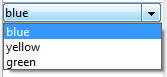 Usted desea mostrar un combo box based on a "colors" basado en una lista "colors", definida en la caja de herramientas (que contiene los valores "blue", "yellow" y "green") y mostrar "green" por defecto: