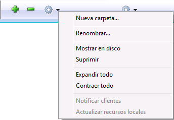 Nota: no es posible renombrar la carpeta Resources. - Mostrar en disco (sólo en modo local activo): muestra la carpeta en una ventana del sistema operativo.