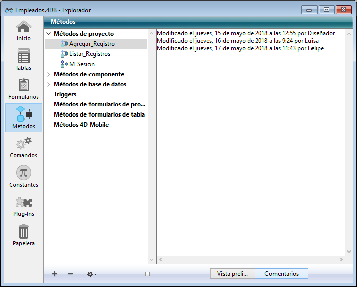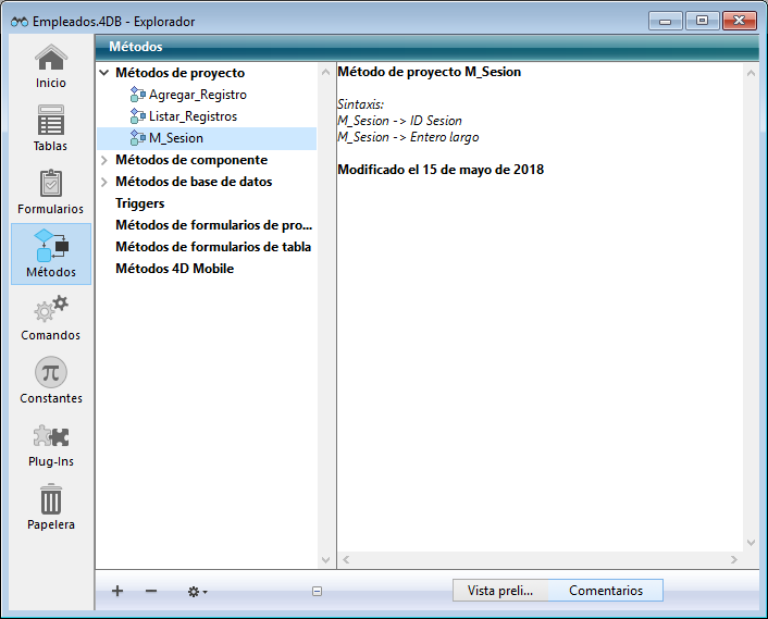 • métodos (base, componentes, proyecto, triggers y formulario),