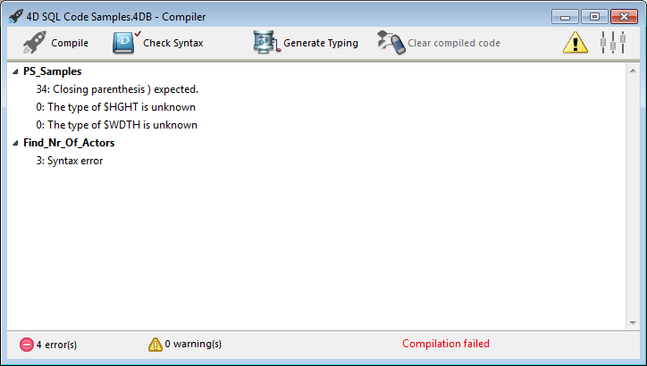 Haga doble clic en cada error detectado con el fin de abrir directamente el método concerniente en el Editor de métodos editor de métodos de 4D; se selecciona la línea que contiene el error y aparece el tipo de error en el área de sintaxis de la ventana. Los comandos Error siguiente/ Error anterior del menú Método del editor le permiten navegar entre las líneas que contienen errores.