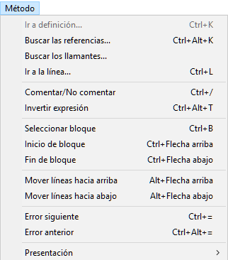 Nota: estos comandos están inactivos si la base no contiene ningún método.