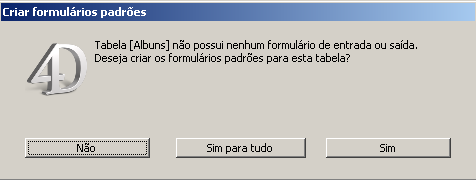 Se você tentar exibir os registros de uma tabela antes de criar um formulário para a tabela, 4D lhe propõe automaticamente os formulários de entrada e saída padrões.