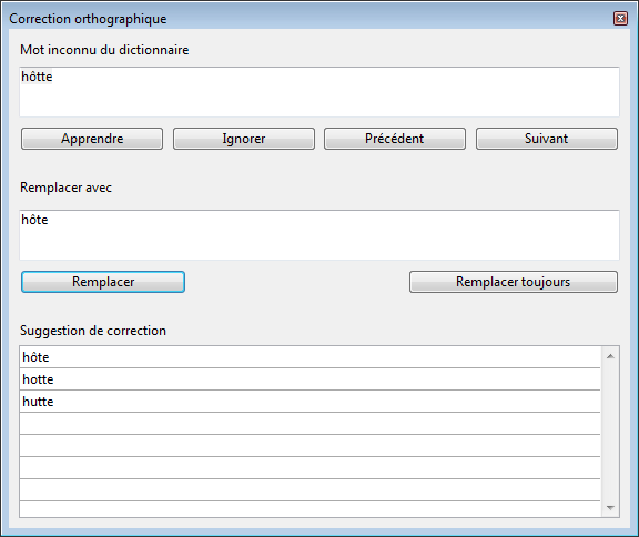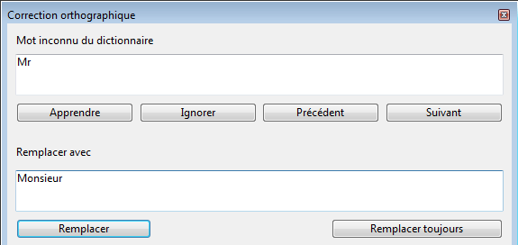 • Remplacer (boîte de dialogue) : remplace le mot du premier champ éditable par le mot du second champ éditable, dans le texte si la sélection dans le texte correspond au mot du premier champ, et passe à l’erreur suivante.