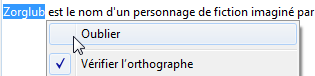• Oublier (menu contextuel) : cette option apparaît lorsqu’un mot précédemment appris est sélectionné. Elle permet de le supprimer de la liste des mots appris et donc, de le signaler à nouveau comme faute d’orthographe potentielle.