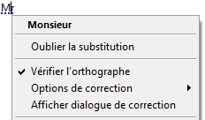 Pour afficher les options de correction, il suffit de cliquer avec le bouton droit de la souris sur un mot inconnu. Le menu contextuel qui apparaît contient les commandes du correcteur :