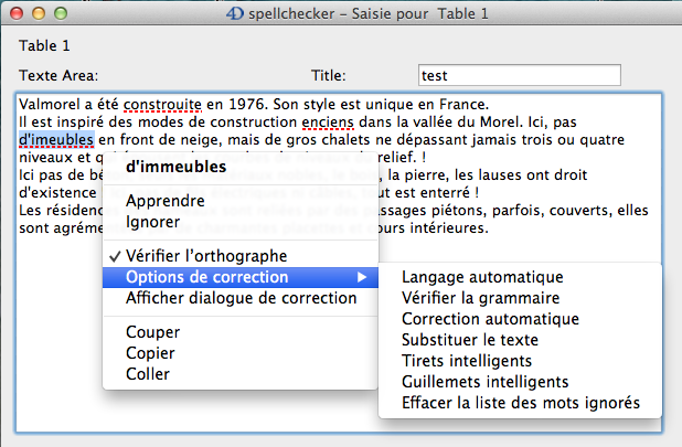 4D inclut des fonctionnalités de correction orthographique intégrées et personnalisables. La vérification orthographique peut être effectuée pour les champs et variables de type Alpha et Texte — ainsi que pour les documents 4D Write Pro.