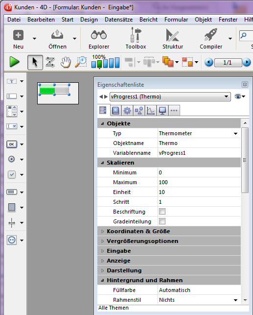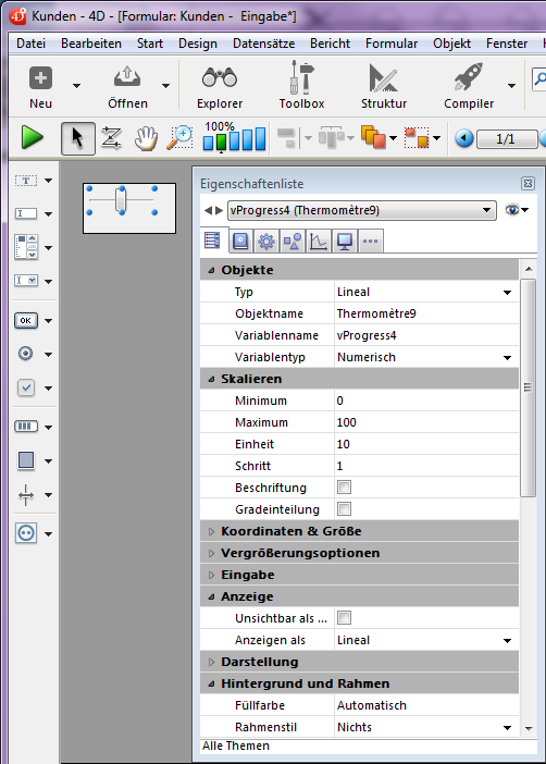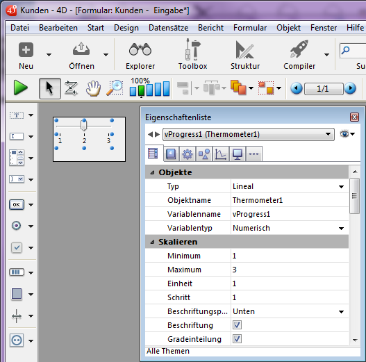Fügt ein horizontales Lineal mit Skala und numerischer Variable hinzu mit dem jeweiligen Mindest- und Maximumwert 0 und 100. Sie können diese Werte über die Eigenschaftenliste verändern.