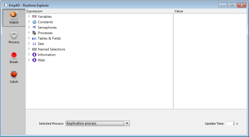 ランタイムエクスプローラーウィンドウには4つのページ (ウォッチ、プロセス、ブレーク、キャッチ) があり、ウィンドウ左のボタンを使用して切り替えます。