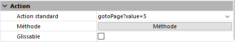 | gotoPage | ak goto page | Formulaire multipage | Onglets, list box, grilles de boutons, pop-up menus/listes déroulantes | Affiche automatiquement la page du formulaire correspondant au numéro de l’élément sélectionné (onglet, ligne de list box, bouton de la grille, élément de pop up menu). Voir aussi Action Aller à page. | ||||||