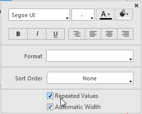 しかし、場合によっては、ブレークエリアの各レコードに対して表示されるように、ブレークカラムの値を繰り返し印刷したい時があります。これを行うには、カラムプロパティである同一値も印刷を選択します。このプロパティはカラムヘッダーに関連づけられたポップアップウィンドウ内に設定されています: