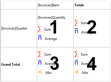 4Dは、選択されたセル内にてリクエストしたそれぞれの集計計算のタイプの計算アイコンを表示します(ただしラベルが追加されていなかった場合)。同じセル内に複数の計算を配置する事もできます。その場合それらは生成されたレポート内では並べて表示されます。以下の図は、小計行内の合計、平均、最小のアイコンを示しているものです: