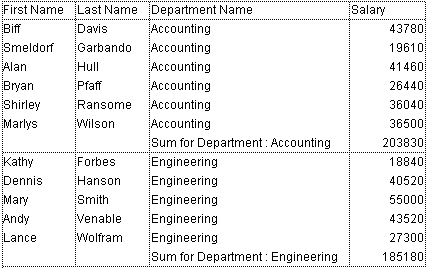 このようなレポートを印刷すると、ブレークカラムの値はブレークごとに1度だけ印刷されます。