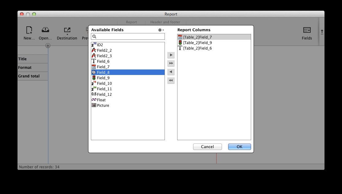 利用可能フィールド にはカレントテーブルのすべてのフィールドに加え、リレートされたテーブルのフィールドが表示されます。レポートカラム には現在レポートに含まれているカラムが表示されます。