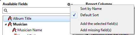 名前で並び替え: フィールドを名前順に並べ替えます。デフォルトのソート: 作成された順にフィールドを並べ替えます。選択されたフィールドを追加: 選択された順にフィールドをレポートカラム のリストに追加します。不足しているフィールドを追加 : すべてのフィールドのうち、まだ含まれていないものをレポートカラム のリストに追加します。