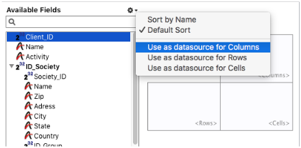 利用可能フィールドリストにて任意のフィールドをダブルクリックすると、使用されていない最初のデータセルに (カラム・行・セルの順に) 割り当てられます。 利用可能フィールドリストにて任意のフィールドを右側のデータセルにドラッグ & ドロップします。 利用可能フィールドリストにて任意のフィールドを選択し、アクションメニューからコマンドを選んでデータセルに割り当てます: