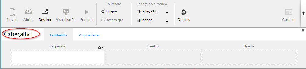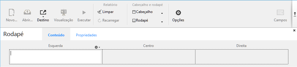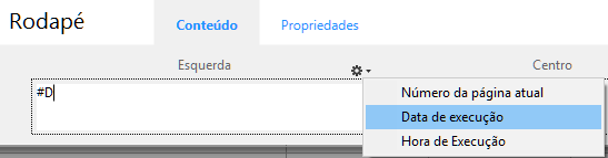 Nas áreas Esquerda, Centro ou Direita, pode introduzir informação que deve ser incluida no relatório. Pode inserir o número de página, assim como também a data ou hora da execução no cabeçalho ou rodapé do relatório. Há um menu local que aparece acima de cada área de entrada que permite inserir variáveis:
