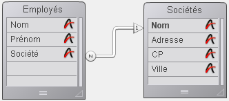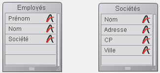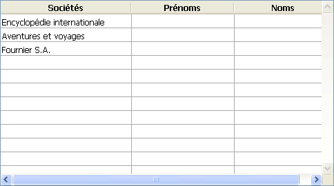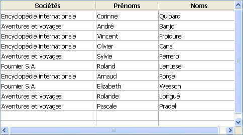 Le champ [Sociétés]Nom est associé à la première colonne d’une list box. Les champs [Employés]Prénom et [Employés]Nom sont associés aux deux colonnes suivantes. La source de données de la list box est la sélection courante.