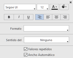 En algunos casos, puede querer repetir los valores de las columnas de ruptura, de tal manera que aparezcan una vez por cada registro del área de ruptura. Puede hacerlo al seleccionar la propiedad Valores repetidos para la columna. Esta propiedad es definida en la ventana contextual asociada al encabezado de la columna: