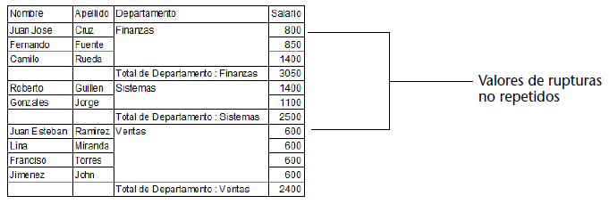 Cuando se imprime un informe como este, los valores para la columna de ruptura se imprimen sólo una vez por ruptura.