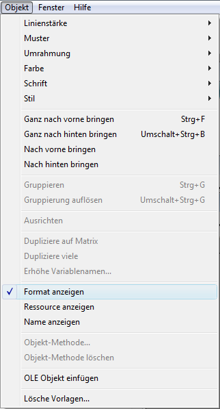 Im Formulareditor können Sie den tatsächlichen Inhalt der statischen Bereiche sehen. Klicken Sie dazu in den Bereich des Formulareditors oder wählen Sie im Menü Objekt>Format anzeigen oder Name anzeigen: