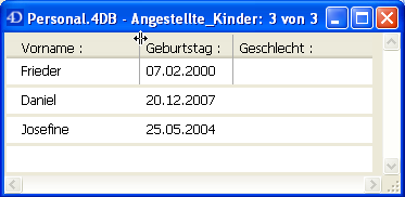 Erscheint dieses Fenster, wird das Formularereignis On Display Detail auch für jede Leerzeile der Liste erzeugt. In diesem Fall gibt es keinen aktuellen Datensatz: Die 4D Funktion Record number gibt -1 zurück und die 4D Funktion Selected record number gibt keinen signifikanten Wert zurück. Über die 4D Funktion Displayed line number erfahren Sie die Nummer der aktuell angezeigten Zeile.