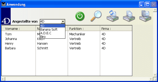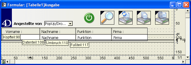 Der Kopfteil enthält ein Bild sowie eine DropDown-Liste zum Auswählen einer Firma. Auf dem Bildschirm erscheinen dann die dazugehörigen Angestellten. Im Formulareditor sieht dieses Formular folgendermaßen aus: