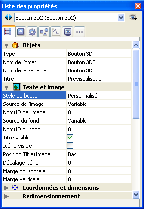 Comme pour les boutons image, l’icône d’un bouton 3D peut provenir de quatre sources différentes : Variable, Bibliothèque d’images, Fichiers de ressources ou Fichier. Une fois la source désignée, vous pouvez indiquer le nom ou le numéro de l’image dans la propriété “Nom/ID de l’image”.