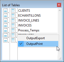 Each table name in the window is preceded by two icons symbolizing the input and output forms. The left-most icon