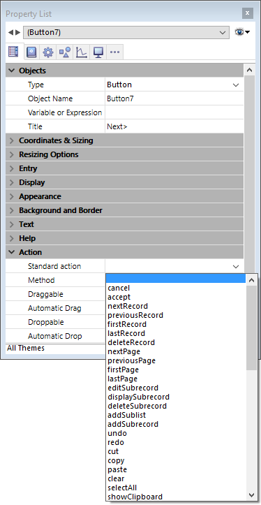 標準アクションとして利用可能ではないアクションをボタンに実行させたい場合、標準アクションのフィールドは空欄にしたままで、ボタンのアクションを指定するオブジェクトメソッドを書きます(メソッドの編集 を参照してください)。