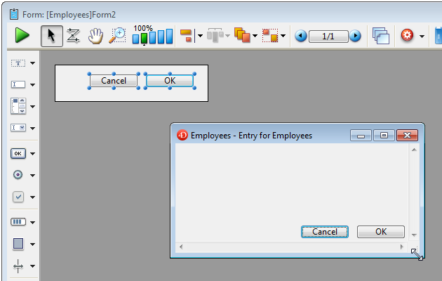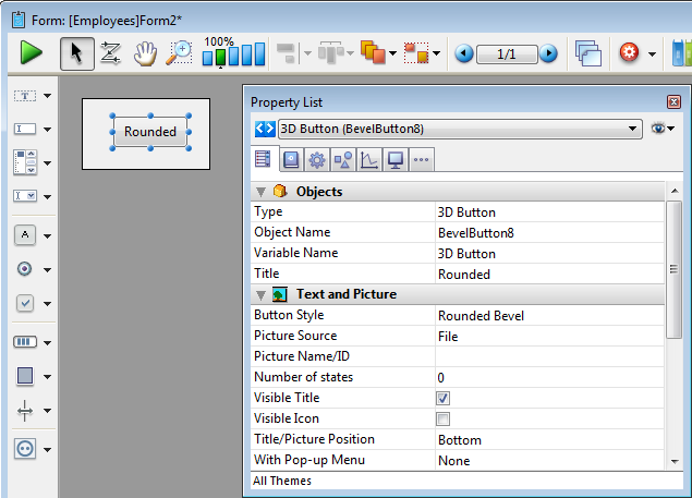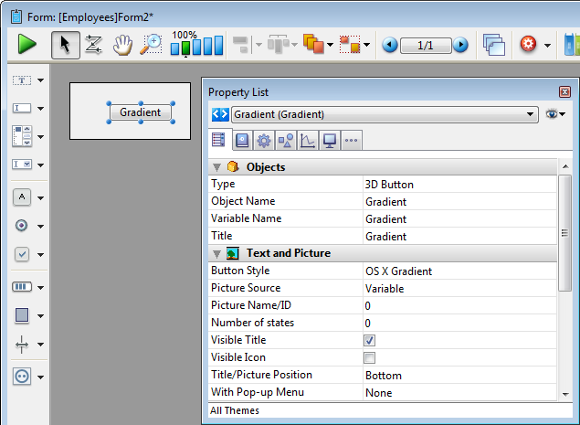 Adds a gradient 3D button whose appearance has been preformatted. You can use the Property list to modify its properties.