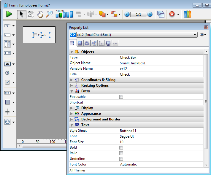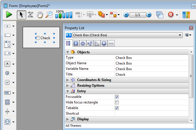 Adds a small-sized check box (available on Mac only). You can use the Property list to modify its properties.