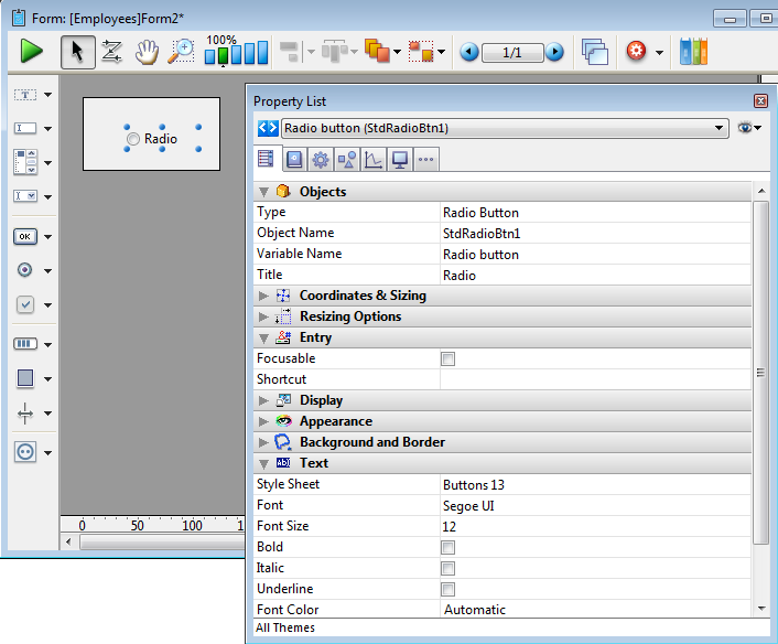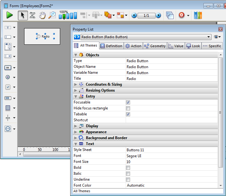 Adds a small-sized radio button (available on Mac only). You can use the Property list to modify its properties.