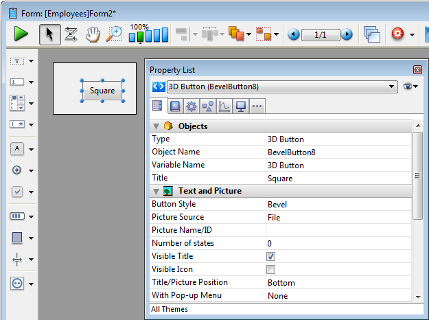 Adds a square 3D button whose appearance has been preformatted. You can use the Property list to modify its properties.