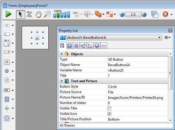 Adds a round 3D button whose appearance has been preformatted. You can use the Property list to modify its properties.