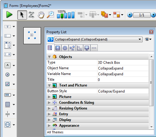 Adds a Collapse-Expand 3D button whose appearance has been preformatted. You can use the Property list to modify its properties.