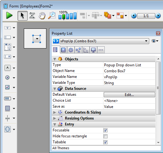 Adds a pop-up menu whose width has been reduced to form a button. (Only available on the Macintosh platform). You can use the Property list to modify its properties.