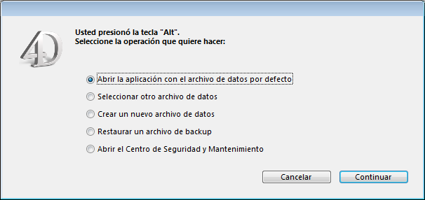 • Durante el lanzamiento de la base, presione la tecla Alt (en Windows) o la tecla Opción (en Mac OS). Aparece la siguiente caja de diálogo: