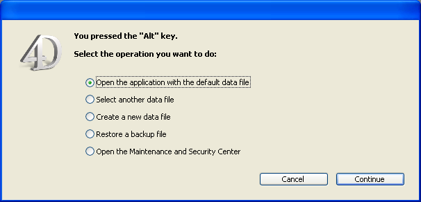 • データベース開始時にAlt (Windows) または Option (Mac OS) キーを押します。以下のダイアログボックスが表示されます: