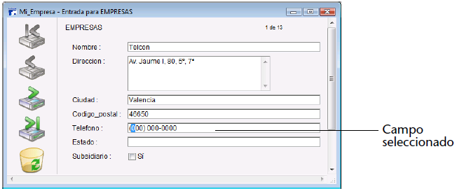 Puede substituir el guión bajo por cualquier otro carácter. Por ejemplo, si muestra “XXXX” y el usuario escribe sólo dos de los caracteres autorizados (por ejemplo “AA”), el campo contendrá “AAXX” al guardar el registro.