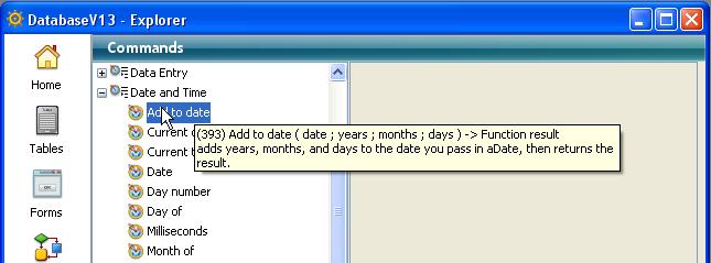 The Commands page displays all built-in 4D commands, grouped by theme. It is the same as the list of commands shown in the Method editor.