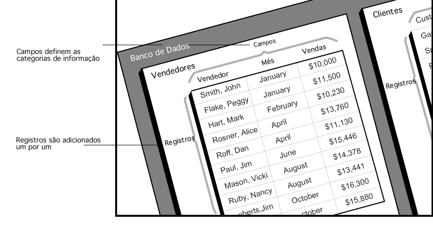 O nome de um campo geralmente identifica a informação armazenada no campo. Por exemplo, os campos podem se chamar Nome, Endereço ou Número telefônico. Cada campo tem um tipo que identifica a classe de informação que pode ser armazenada: números, datas, caracteres alfanuméricos e outros. Como cada campo contém um tipo específico de dados, você pode realizar cálculos e outras operações com a informação guardada neles. Por exemplo, pode somar os números dos campos. Pode comparar a data de um campo com a de outro. Pode mostrar o nome de uma pessoa (armazenado em um campo) depois de seu sobrenome (armazenado em outro campo) para construir a primeira linha de uma etiqueta de correio.