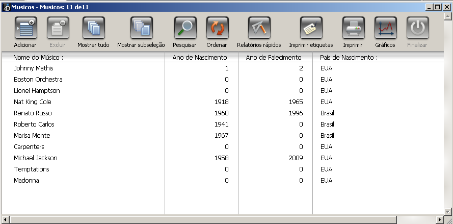 Na imagem anterior, o registro de cada uma das pessoas necessita o mesmo tipo de dados. O banco de dados cresce de acordo ao número de registros de artistas armazenados.