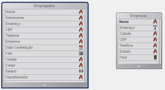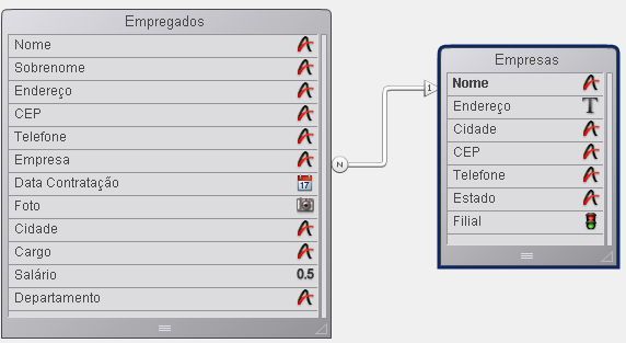 A imagem a seguir mostra a estrutura de um banco de dados multi-tabelas no qual duas tabelas estão relacionadas. A seta entre o campo Empresa e o campo Nome representa esta relação.